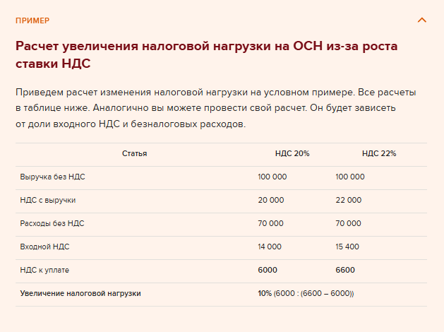 Из-за повышения основной ставки НДС на 2 процента налоговая нагрузка может увеличиться незначительно, если у вас суммы входного и исходящего НДС сопоставимы. При высокой доле расходов без НДС разница может оказаться существенной и это нужно учитывать при налоговом планировании. Покажем расчет на примере ниже.