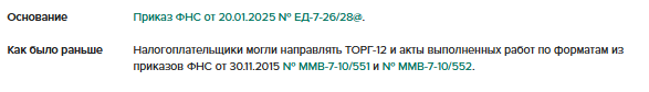 С 1 января налогоплательщики не смогут обмениваться через операторов ЭДО электронными документами в некоторых форматах. Изменения коснутся только тех, кто сейчас принимает и отправляет ТОРГ-12 и акты выполненных работ по форматам из приказов ФНС от 30.11.2015 № ММВ-7-10/551 и № ММВ-7-10/552. Можно создавать акты и товарные накладные в электронной форме в формате УПД 5.03, который утвердил приказ ФНС от 19.12.2023 № ЕД-7-26/970@.