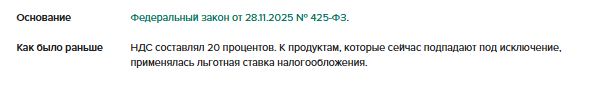 Исключение составят спреды, молокосодержащие продукты с заменителем молочного жира и сливочно-растительные топленые смеси. Их с 2026 года облагают по общей ставке НДС 22 процента. Но соответствующие коды таких продовольственных товаров из постановления Правительства от 31.12.2004 № 908 пока не исключили.