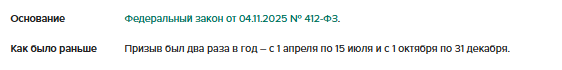 С 1 января 2026 года граждан будут призывать на военную службу весь год. В этот период работают призывные комиссии, граждане проходят отбор и отправляются к местам службы. Теперь призывные комиссии будут работать с 1 января по 31 декабря, в этот же период граждане будут проходить медосвидетельствование и профессиональный психологический отбор. А весной и осенью их будут отправлять непосредственно к местам службы.