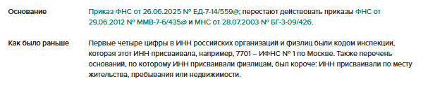 Изменили структуру ИНН. Так, первые две цифры для российской организации и физлица – это код управления ФНС по региону, на территории которого присвоен ИНН, следующие две цифры – индекс, определяемый ФНС. Для иностранной организации первые четыре цифры – индекс, определяемый ФНС.