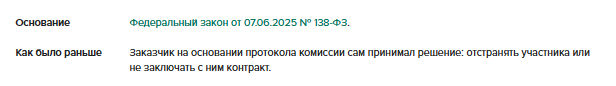 С 1 января процедуру отстранения участников госзакупки изменили. Если обнаружат несоответствие требованиям, то участника отстраняет комиссия по закупкам. Комиссия также может принять решение об отказе от заключения контракта с победителем. Перечень для отказа расширили: любая недостоверная информация, которую участник закупки предоставит для оценки своей заявки, позволит комиссии или заказчику отстранить участника.