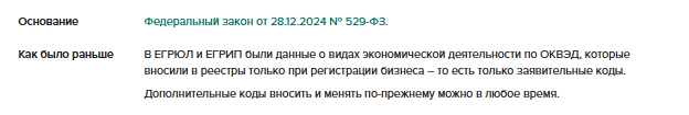 С 1 января в ЕГРЮЛ и ЕГРИП будет два типа кодов о деятельности юрлиц и ИП – заявительный и отчетный. Это сделали для того, чтобы государство знало, чем на самом деле вы занимаетесь и положены ли вам преференции. Ведь большинство мер поддержки привязано к кодам ОКВЭД.