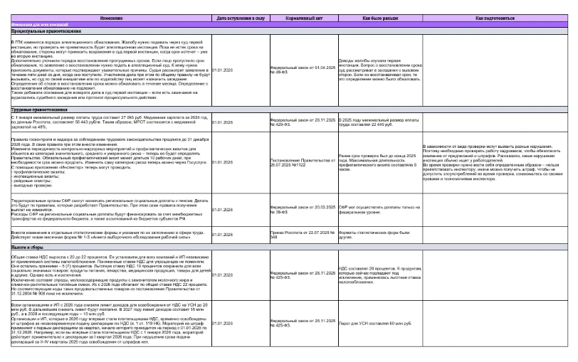 В 2026 году вступают в силу изменения сразу в нескольких федеральных законах – от рекламы до КоАП и ГПК. Юристы рискуют пропустить важные нюансы в договорах, процессе и взаимодействии с чиновниками. В навигаторе Системы Юрист – аналитика ключевых изменений для юриста на 2026 год по темам: договоры, труд, права потребителей, налоговые риски, госконтракты. Каждый блок нововведений сопровождаем пояснением, как перестроить работу юриста и какие документы обновить. Бонус – онлайн-таблица, которую можно скачать и адаптировать под задачи отдела.