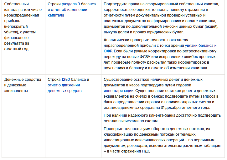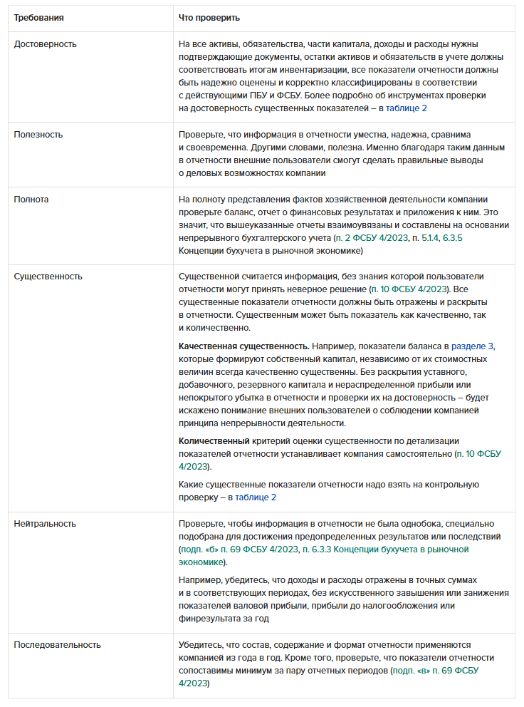 В начале января каждого года Минфин выпускает рекомендации аудиторам по проверке бухгалтерской отчетности. Там содержатся контрольные точки в виде требований к отчетности, которые надо проверить. Соответственно, у аудиторов и министерства одинаковый перечень обязательных критериев проверки отчетности. Подробнее о требованиях – в таблице 1 ниже.