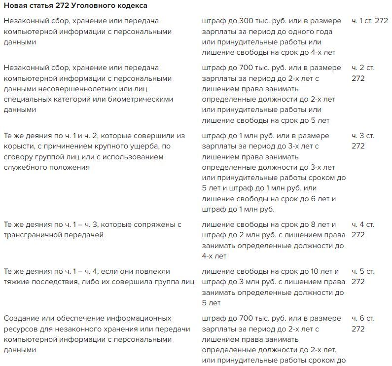 Кроме того, в Уголовный кодекс внесли новую статью, которая предусматривает наказание за незаконный сбор, хранение и передачу компьютерной информации с персональными данными – штраф до 300 тыс. руб. или сумму зарплаты за период до одного года или принудительные работы или лишение свободы на срок до 4-х лет.
