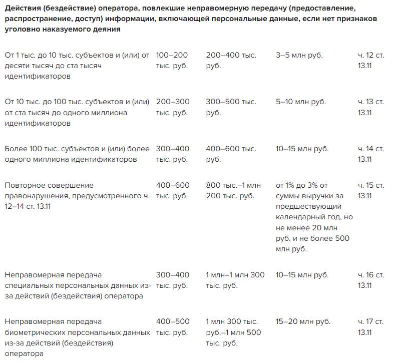 Так, за неправомерную передачу персданных штраф для юридических лиц составляет: