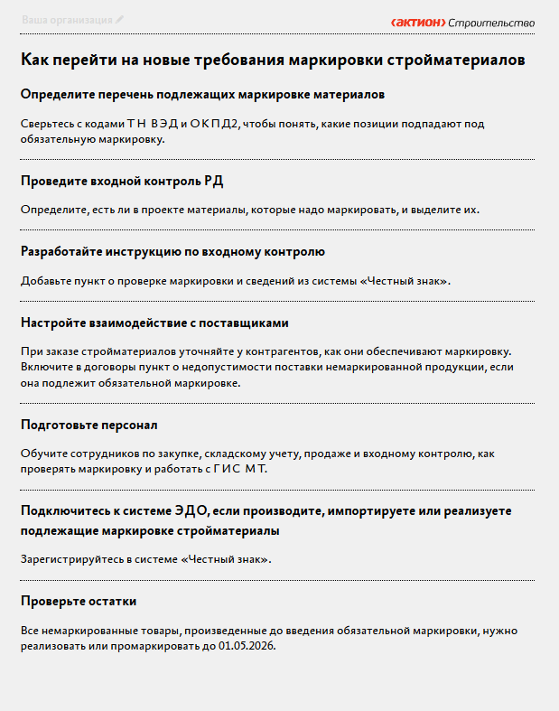 Как стало. С 1 сентября 2025 года маркировка становится обязательной для ключевых стройматериалов, а сведения о них следует вносить в ГИС МТ. Это меняет подход не только для производителей и поставщиков, но и для строительных организаций. Им теперь придется учитывать маркировку при входном контроле и закупках. Как подготовиться к изменениям, описали в памятке.