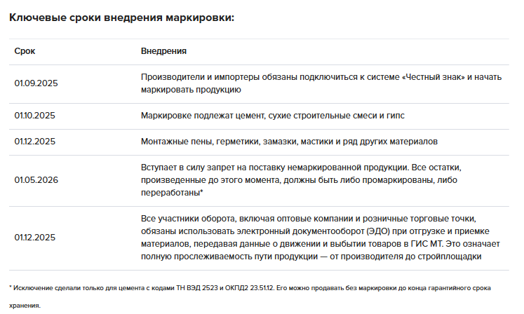 С 1 сентября 2025 года вступило в силу постановление Правительства от 31.05.2025 № 820, которое ввело обязательную маркировку отдельных видов стройматериалов. Документ установил порядок, сроки перехода и обязанность участников рынка передавать сведения о товарах в государственную информационную систему мониторинга (ГИС МТ). Главная цель нововведения — обеспечить прозрачность оборота строительных материалов, исключить нелегальную продукцию и повысить качество и безопасность строительства. Сроки внедрения маркировки описали в таблице.