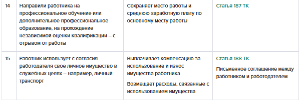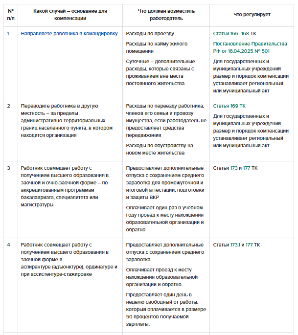 Работники имеют право на иные компенсационные выплаты, когда во время исполнения трудовых обязанностей вынуждены нести затраты. Работодатель должен их возместить. Виды компенсаций и гарантий устанавливает трудовое законодательство, например статья 165 и раздел VII ТК. Образовательная организация вправе устанавливать повышенный размер компенсации и дополнительные гарантии в коллективном договоре, соглашении или отдельном локальном акте.