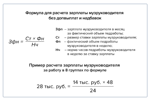 Пример расчета зарплаты музыкального руководителя, работающего с восемью группами, без допнадбавок и выплат привели ниже.