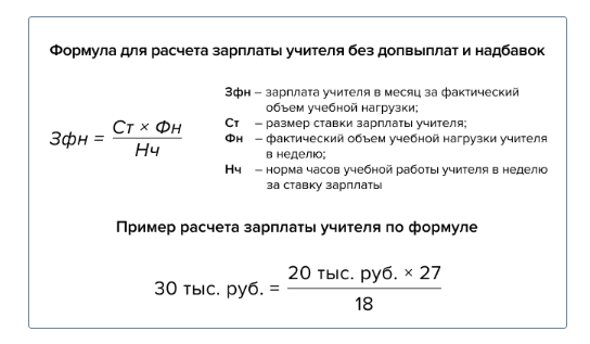 Формулу и пример расчета зарплаты учителя за фактический объем учебной нагрузки привели ниже.
