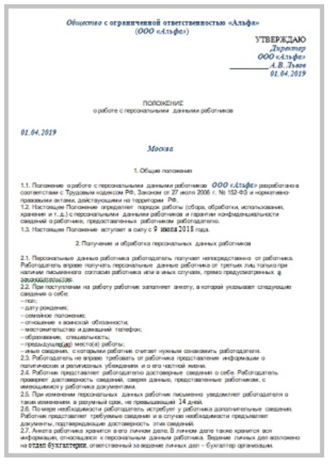 Рисунок 2. Образец положения о работе с персональными данными сотрудников