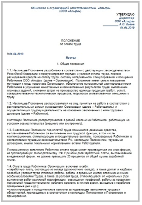 Типового бланка положения об оплате труда в законодательстве нет. Этот документ составляют в произвольной форме. Регулярно обновляйте положение об оплате труда, если изменилось законодательство. За устаревшие документы инспекторы ГИТ оштрафуют.