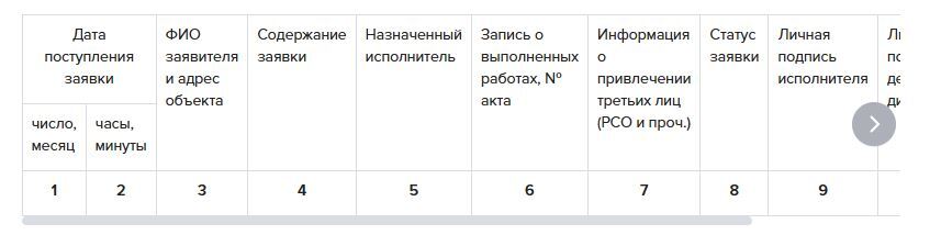 Визуально журнал учета заявок должен быть прошнурован, пронумерован и скреплен печатью аварийно-диспетчерской службы. Мы показали, какие колонки могут быть в журнале. Смотрите таблицу 1.