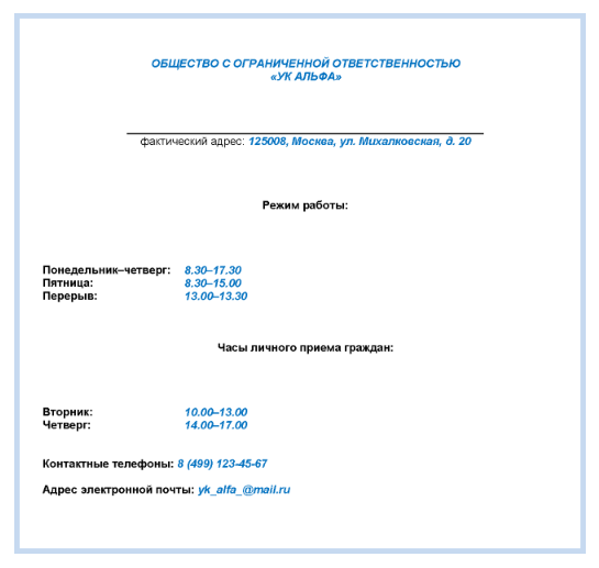 Около входной двери в офис УО разместите вывеску с краткой информацией об организации. Пример вывески мы показали на рисунке 2.