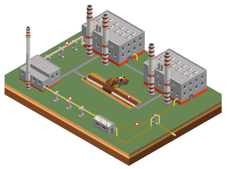 2. На площадке прокладывают трубопроводы тепловой сети, или вы видите трубопроводы с зелеными и красными обозначениями. Согласно ГОСТ 14202-69 зеленым обозначают трубы с водой, а красным – трубы с паром. Также трубопроводы тепловой сети можно определить по внешнему виду, так как они часто закрыты защитной оболочкой цвета оцинкованной стали. В зависимости от характеристик трубопровода тепловой сети он может иметь признак опасности «Оборудование под давлением» (2.2).