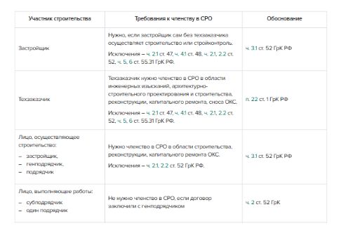 Существует ряд ситуаций, когда компании необязательно вступать в СРО. Например, когда застройщик сам не выполняет строительные работы, а нанимает профессиональных участников рынка. Смотрите такие ситуации в таблице ниже.