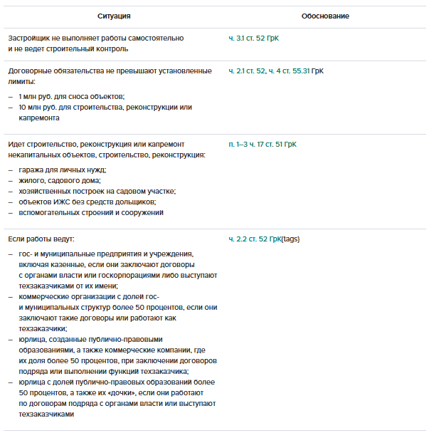 Есть и исключения. Например, случаи, когда размер обязательств по договору не превышает 10 млн руб. либо если работы выполняют лица, указанные в части 2.2 статьи 52 ГрК. Или если региональный закон возлагает стройконтроль на орган власти субъекта или подведомственное ему учреждение по отдельным объектам из утвержденных инвестпрограмм в сферах теплоснабжения, водоснабжения и водоотведения (ч. 2.2 ст. 53 ГрК).