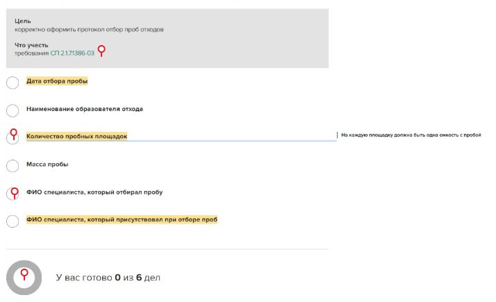 Проверьте акт отбора проб отходов по чек-листу Системы. Чек-лист можно заполнить онлайн или распечатать и взять с собой на выезд. На скриншоте отметили подсказки по работе с чек-листом.