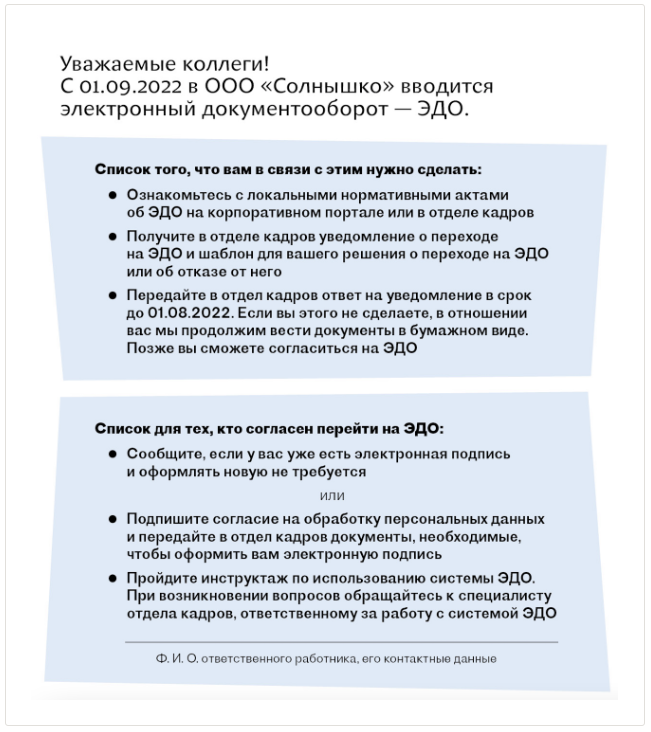 Чтобы объяснить сотрудникам, что нужно сделать в связи с переходом на электронный документооборот, раздайте каждому памяткуjpg. В ней укажите дату, когда введете электронный документооборот, и пропишите, когда работникам нужно принять решение – оставить документы на бумаге или перейти на цифровой формат обмена документами.