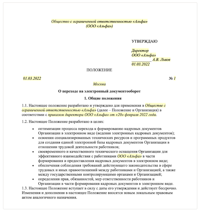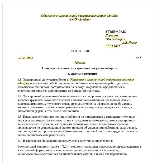 Чтобы перейти на электронный документооборот в компании, составьте и утвердите два локальных акта – положение о переходе на электронный документооборот и положение о порядке ведения электронного документооборота.