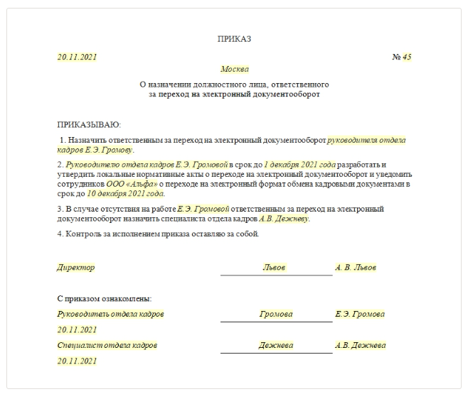 Чтобы назначить ответственного за переход на электронный кадровый документооборот, составьте приказ в произвольной форме. Укажите в документе Ф. И. О. и должность сотрудника, которому поручили обязанности по переходу на электронные документы. Подпишите документ у руководителя организации и сотрудников, которых внесли в приказ.