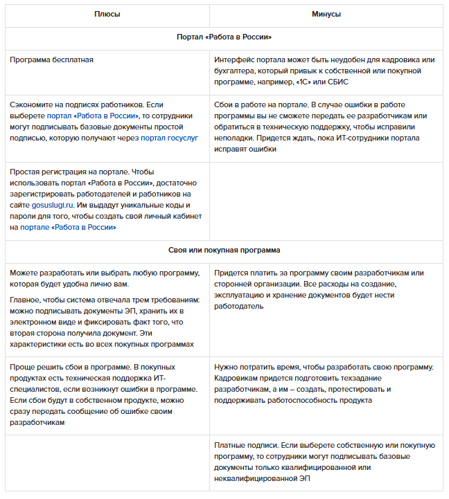 Определите, как вы будете оформлять электронные документы – с помощью платформы «Работа в России» или через собственную программу. Чтобы принять решение, оцените плюсы и минусы двух платформ в таблице.