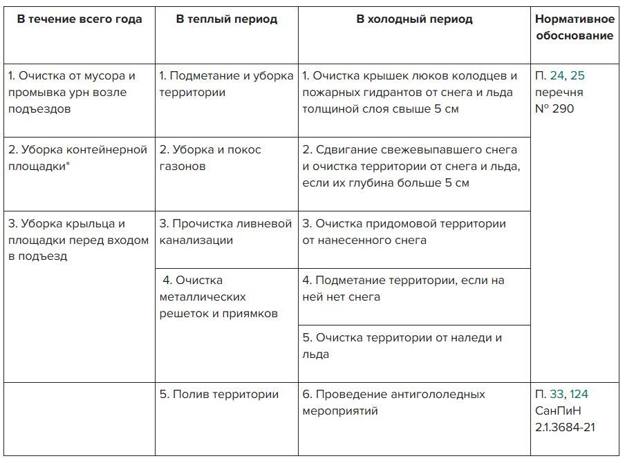 Руководствуйтесь перечнем № 290, чтобы определить минимальный состав работ по содержанию придомовой территории. Состав дополнительных обязательных работ устанавливают санитарно-гигиенические требования и решения собственников в МКД.