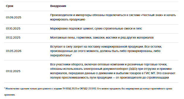 С 1 сентября 2025 года вступило в силу постановление Правительства от 31.05.2025 № 820, которое ввело обязательную маркировку отдельных видов стройматериалов. Документ установил порядок, сроки перехода и обязанность участников рынка передавать сведения о товарах в государственную информационную систему мониторинга (ГИС МТ). Главная цель нововведения — обеспечить прозрачность оборота строительных материалов, исключить нелегальную продукцию и повысить качество и безопасность строительства. Сроки внедрения маркировки описали в таблице.