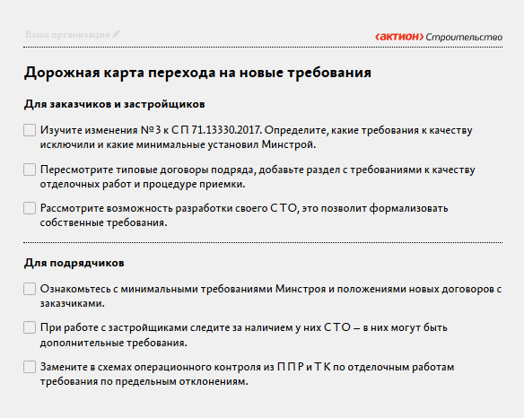 Как стало. Если организация утвердила свой СТО, то применяют его. Если нет, то критерии качества определяет договор подряда между заказчиком и подрядчиком. Требования в договоре и в СТО не могут быть ниже минимальных норм Минстроя (приказ № 91/пр). Подробные изменения смотрите в отдельном справочнике. А как перейти на новые требования, смотрите в памятке.