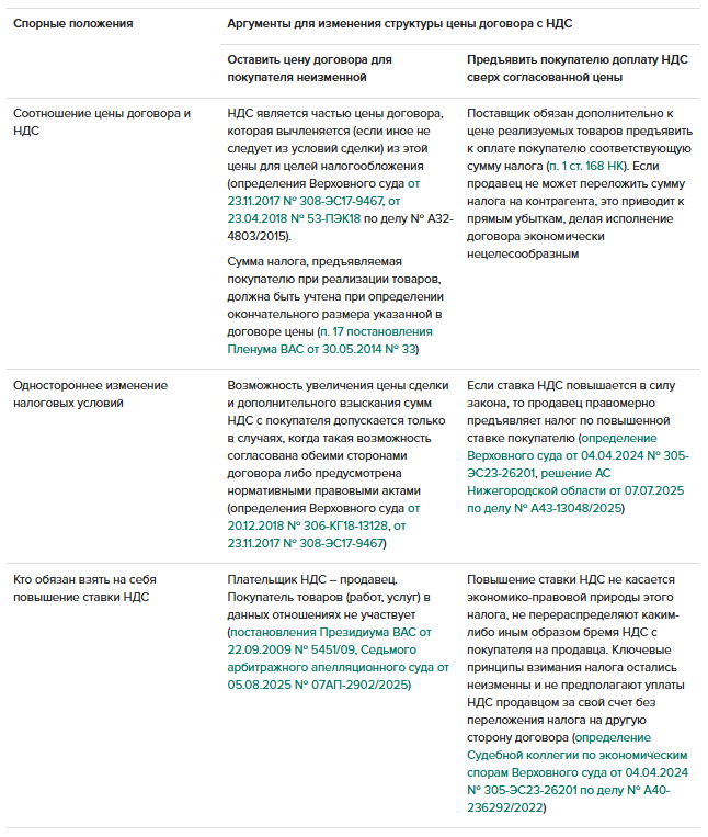 В таблице ниже смотрите аргументы за и против предъявления дополнительной суммы НДС покупателю из-за повышения ставки на 2 процента. Это поможет сторонам найти компромиссное решение.