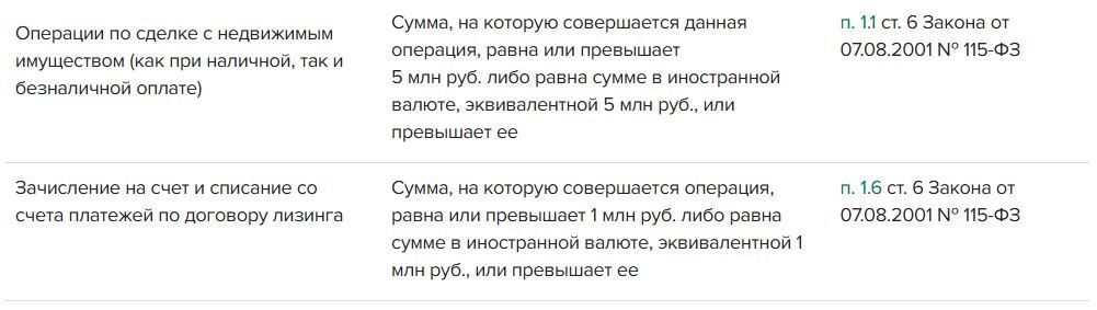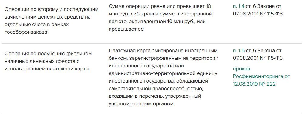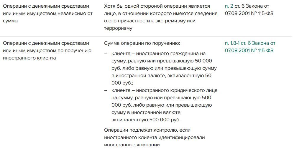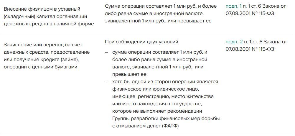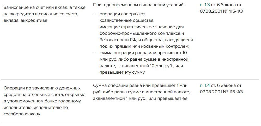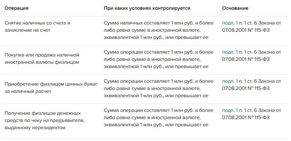 Полный перечень операций, которые подлежат обязательному контролю банками, в таблице.
