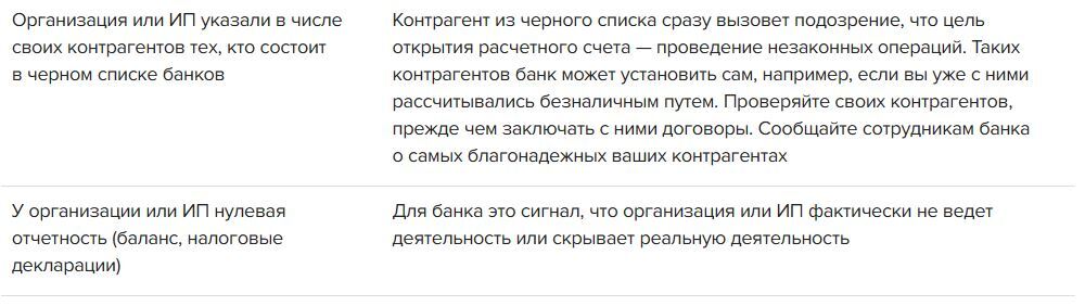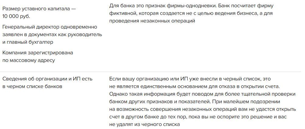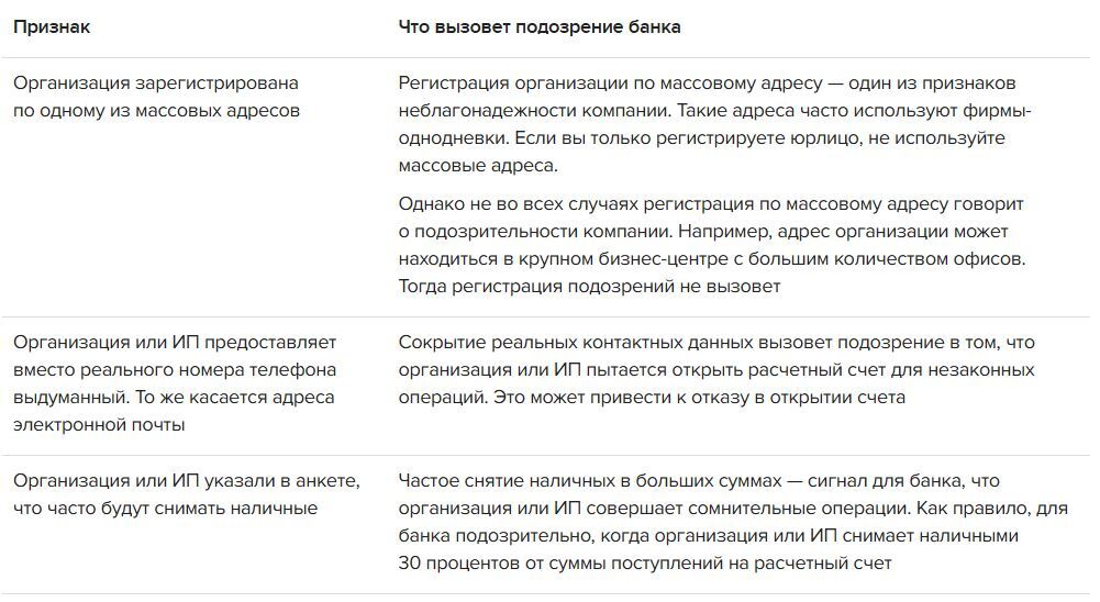 Это распространенные причины отказа в открытии счета. Помимо этих причин, в каждом банке могут быть свои признаки. Их банк прописывает в правилах внутреннего контроля. Помните, что банк может отказать в открытии счета по любым признакам, которые говорят о фиктивности организации или о том, что организация или ИП открывает счет с целью проведения незаконных операций.