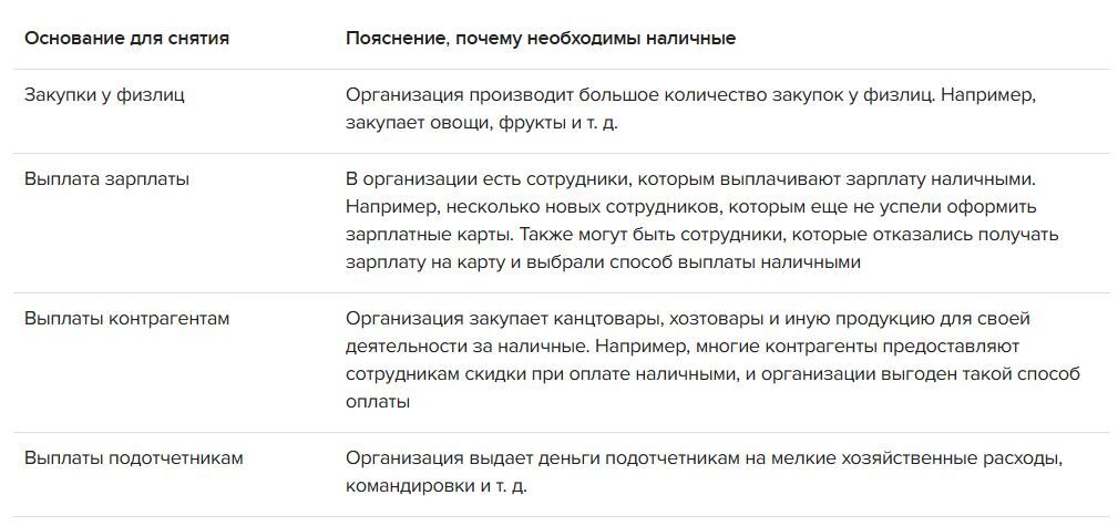 Поэтому фактически при каждом снятии большой суммы банки могут запросить пояснения о назначении таких сумм. В связи с этим бухгалтеру нужно быть готовым, что на каждое снятие крупной суммы наличных придется составлять пояснение и представлять документы для оправдания этой операции. Например, организация может снимать наличные в следующих случаях: