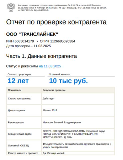 Такой отчет вы можете скачать по вам и вашим контрагентам. Все данные в сервис «Главбух Контрагенты» загружены в удобном формате. Чтобы воспользоваться сервисом, активируйте доступ и введите в строке поиска ИНН. Главбух Контрагенты защищает от претензий налоговиков из-за статьи 54.1 НК, штрафов и доначислений. Проверяет компании по методике ФНС, предупреждает о бухгалтерских рисках, дает рекомендации, какими документами подстраховаться и готовит отчет по осмотрительности, который принимают как в налоговой, так и в судах.