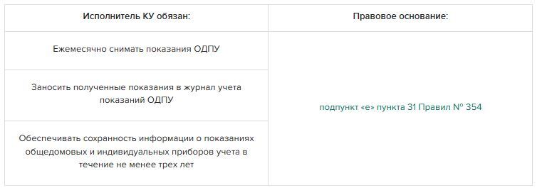 Итак, обязанности исполнителя КУ по снятию показаний ОДПУ прямо закреплены в законе и сводятся к следующему:
