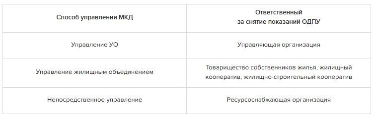 Получается, что показания снимает УО, ТСЖ, ЖК, ЖСК или РСО в зависимости от способа управления МКД.