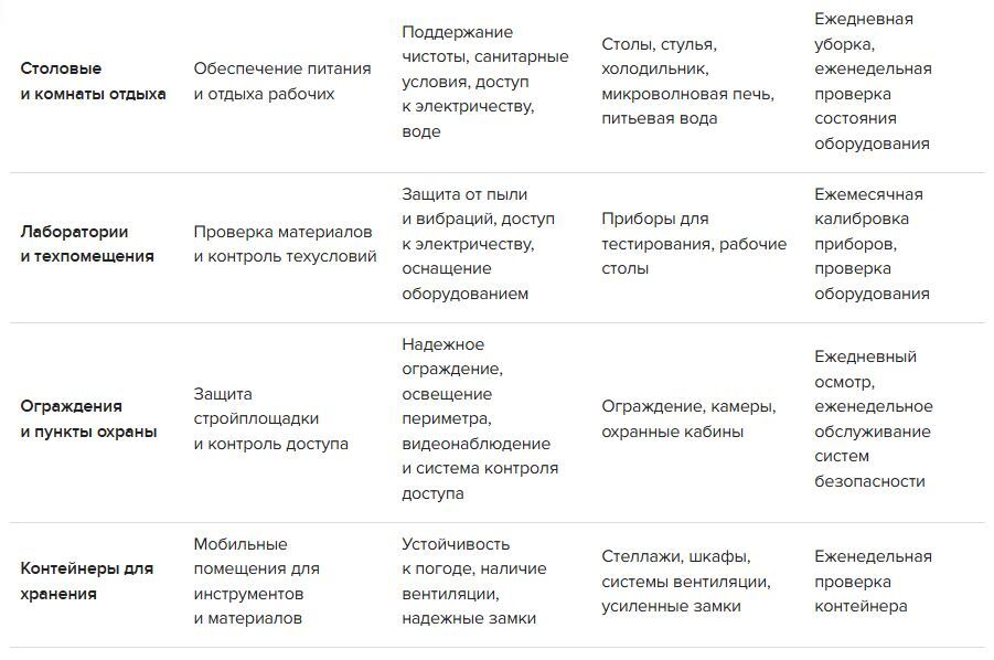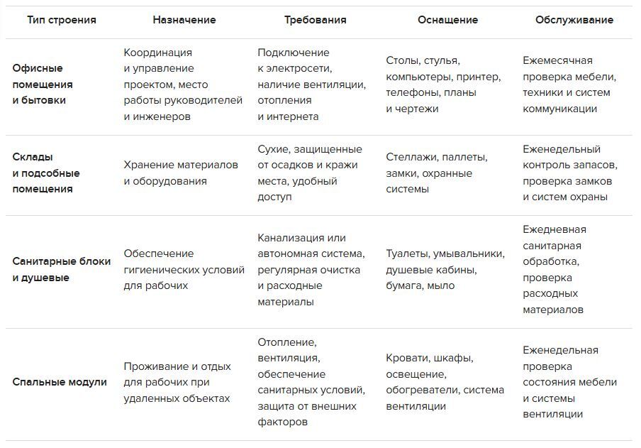 Рассмотрим необходимые ВЗиС и их ключевые характеристики. Всего 11 видов временных зданий и сооружений.