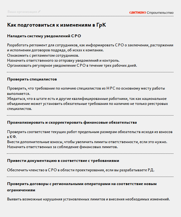 Поскольку специалисты теперь могут сами уведомлять национальное объединение о своем увольнении, скрыть отсутствие кадровых ресурсов невозможно. Также СРО сможет в своих правилах установить требования по наличию иных специалистов, занятых в строительстве, сведения о которых должны включить в НРС. К таким специалистам могут отнести, например, инженеров строительного контроля или сметчиков. Если выяснят, что у компании нет необходимого состава специалистов или она не уведомляет СРО о договорах в установленные сроки, СРО могут исключить члена из организации.