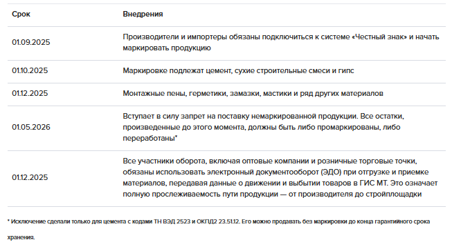 С 1 сентября 2025 года вступило в силу постановление Правительства от 31.05.2025 № 820, которое ввело обязательную маркировку отдельных видов стройматериалов. Документ установил порядок, сроки перехода и обязанность участников рынка передавать сведения о товарах в государственную информационную систему мониторинга (ГИС МТ). Главная цель нововведения — обеспечить прозрачность оборота строительных материалов, исключить нелегальную продукцию и повысить качество и безопасность строительства. Сроки внедрения маркировки описали в таблице.