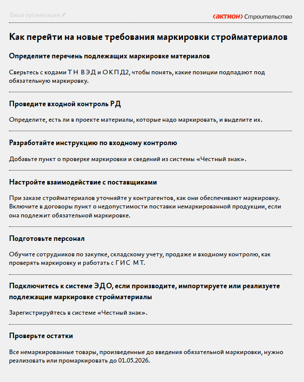 Как стало. С 1 сентября 2025 года маркировка становится обязательной для ключевых стройматериалов, а сведения о них следует вносить в ГИС МТ. Это меняет подход не только для производителей и поставщиков, но и для строительных организаций. Им теперь придется учитывать маркировку при входном контроле и закупках. Как подготовиться к изменениям, описали в памятке.