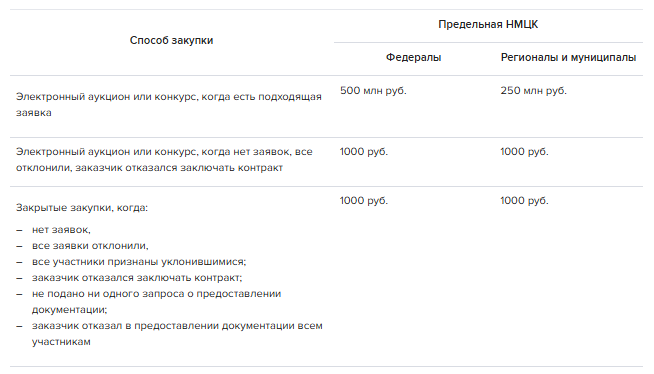 Условие 2. НМЦК превышает предельные размеры, которые установило Правительство. При этом предельные значения НМЦК зависят от причины, по которой закупка не состоялась. Разобраться поможет таблица.