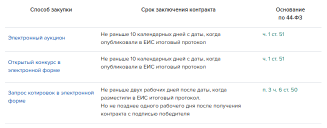 Сроки заключения контракта в зависимости от способа закупки