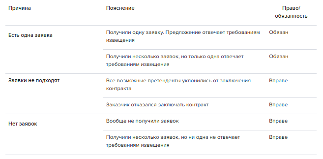 Если закупка не состоялась, у заказчика есть право и обязанность заключить контракт с едпоставщиком. Заказчик обязан заключить контракт, когда получил всего одну заявку и она отвечает требованиям извещения или из всех заявок комиссия допустила только одну. В остальных случаях заказчик вправе заключить контракт с единственным поставщиком либо провести повторную закупку. Все причины, по которым закупка не состоялась, смотрите в таблице.