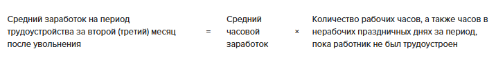 Средний заработок на период трудоустройства за второй (третий) месяц после увольнения = Средний дневной заработок × Количество рабочих дней, а также нерабочих праздничных дней за период, пока работник не был трудоустроен