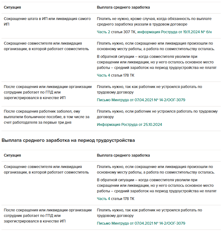На практике встречаются ситуации, когда сложно определить, нужно платить бывшему работнику средний заработок или нет. Решения – в таблице ниже.