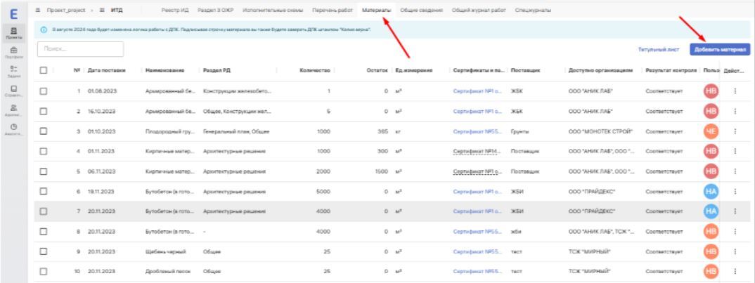 Вкладка модуля ИТД «Материалы» – аналог журнала входного контроля (ЖВК). В него вносят информацию обо всех материалах на стройплощадке и о сопроводительной документации к ним. Чтобы добавить материал, действуйте так.